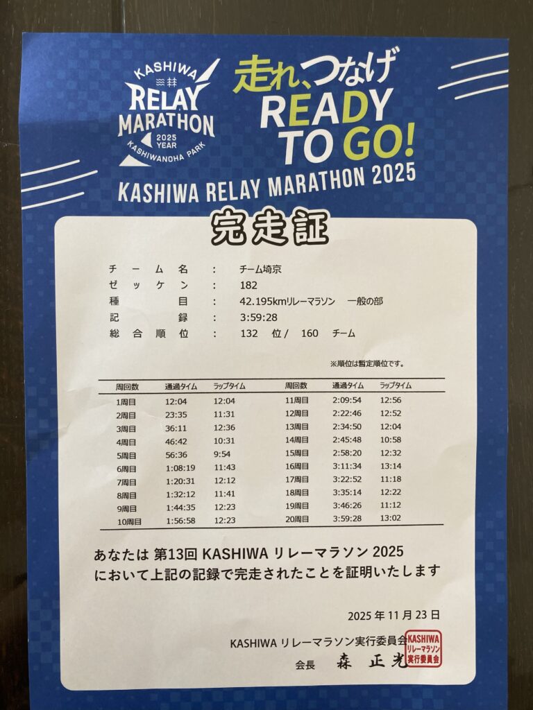 第13回KASHIWAリレーマラソン2025を完走しました